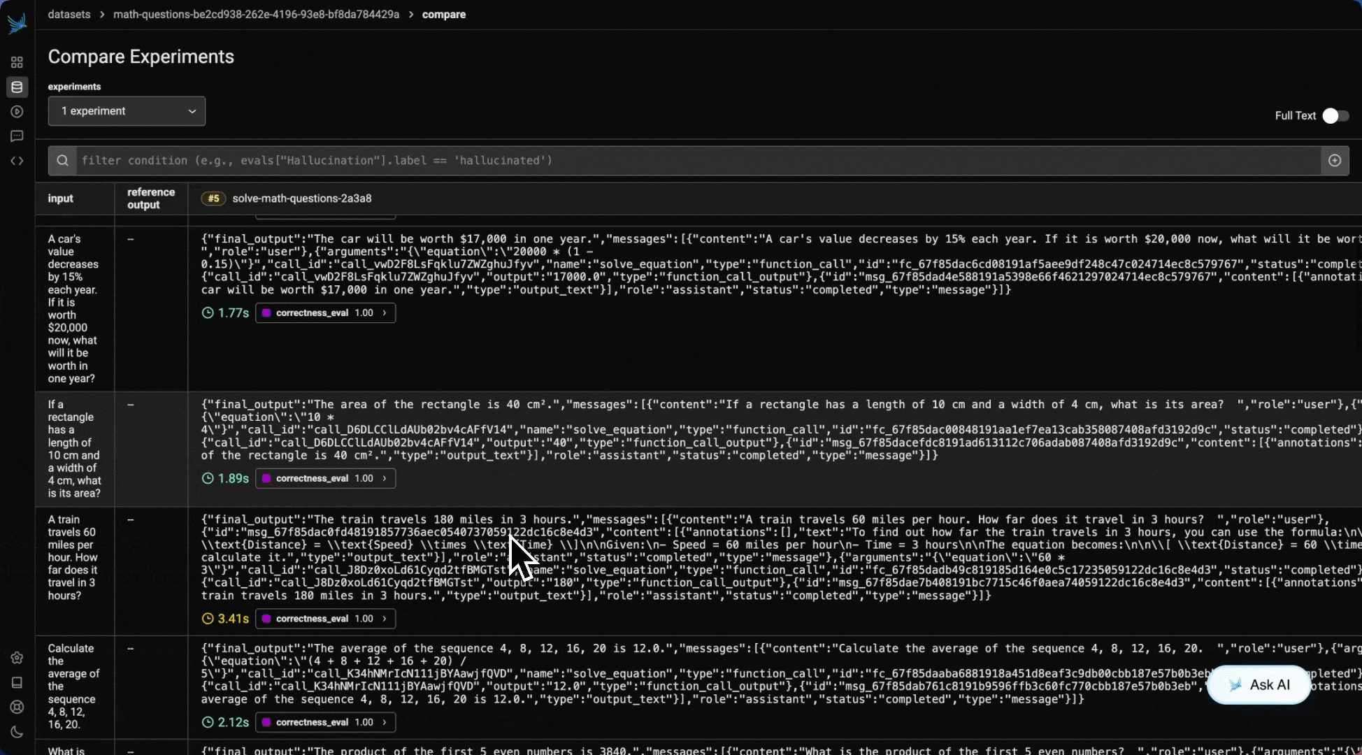 With our dataset of questions we generated above, we can use our experiment feature to track changes across models, prompts, parameters for our agent. Let’s create this dataset and upload it into the platform.View Traces in Phoenix
