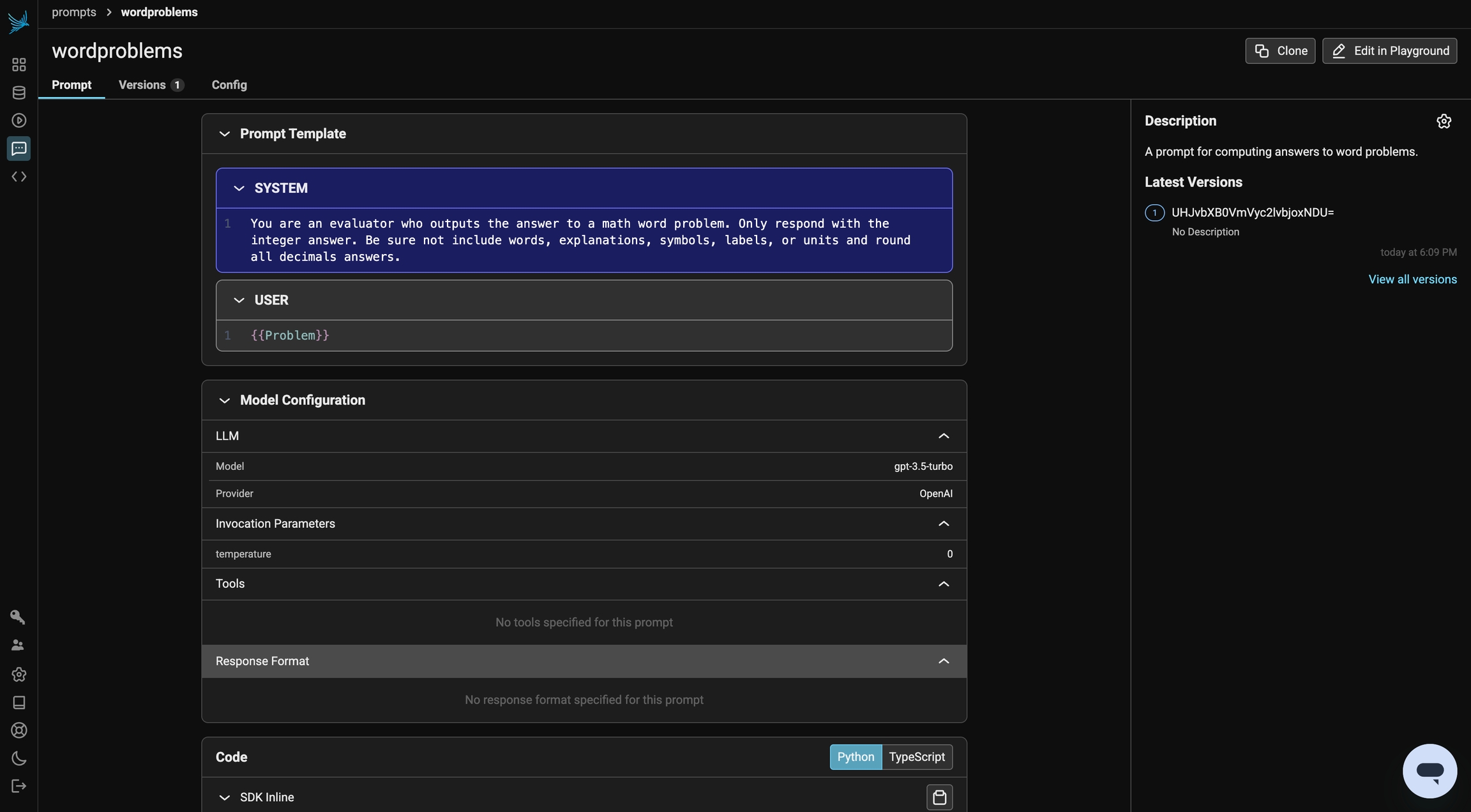 from openai import OpenAIfrom openai.types.chat.completion_create_params import CompletionCreateParamsBasefrom phoenix.client.types import PromptVersionparams = CompletionCreateParamsBase( model="gpt-3.5-turbo", temperature=0, messages=[ { "role": "system", "content": "You are an evaluator who outputs the answer to a math word problem. Only respond with the integer answer. Be sure not include words, explanations, symbols, labels, or units and round all decimals answers.", }, {"role": "user", "content": "{{Problem}}"}, ],)prompt_identifier = "wordproblems"prompt = PhoenixClient().prompts.create( name=prompt_identifier, prompt_description="A prompt for computing answers to word problems.", version=PromptVersion.from_openai(params),)