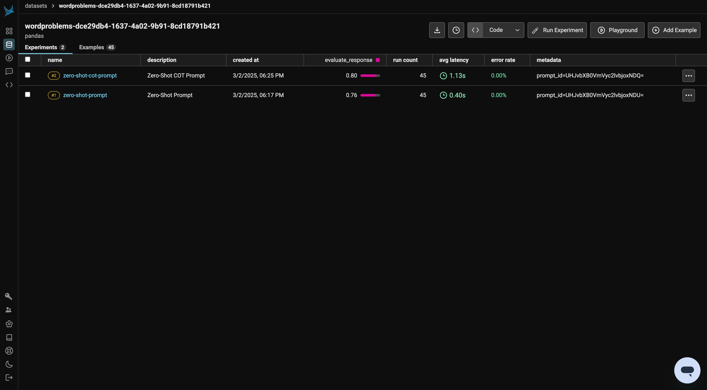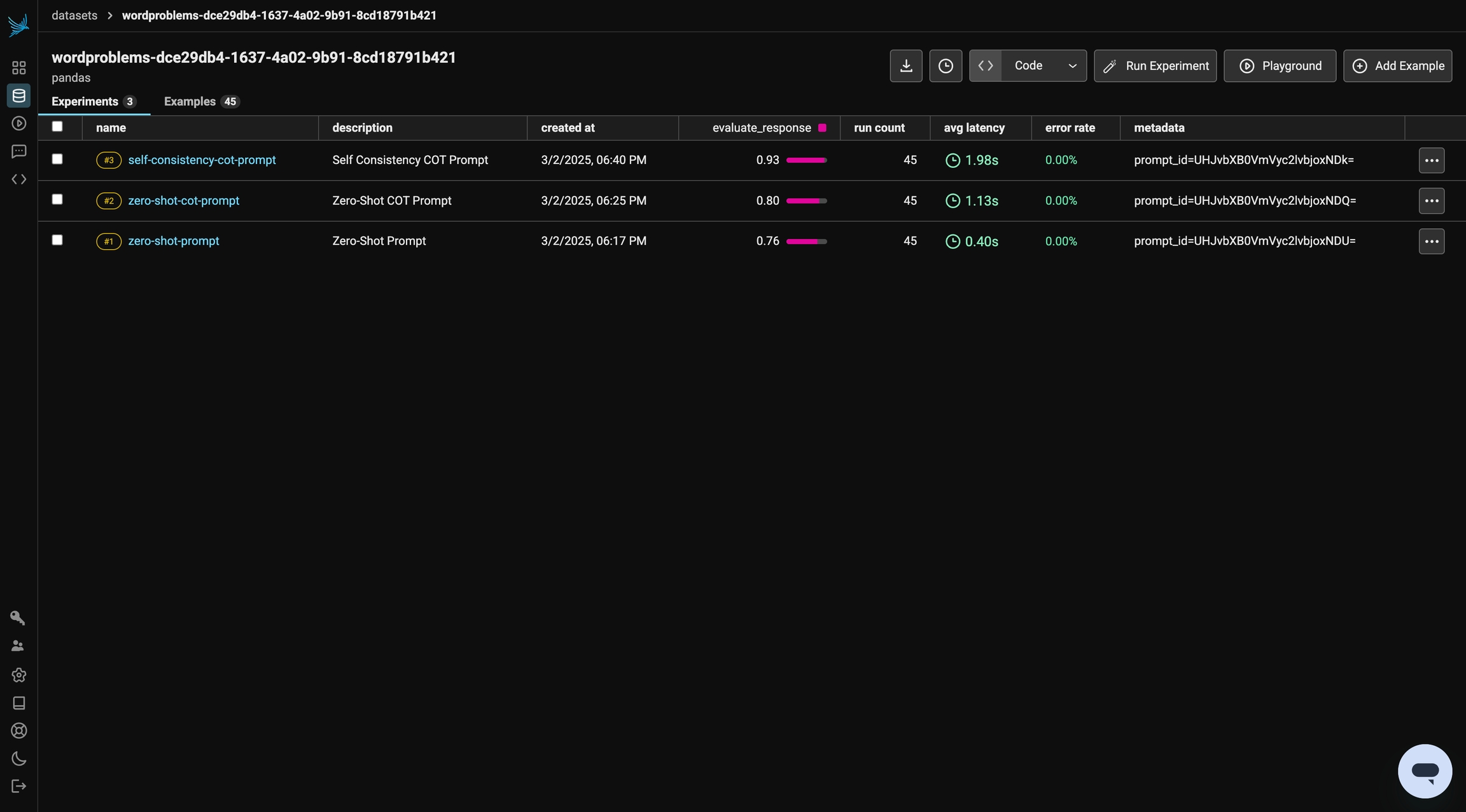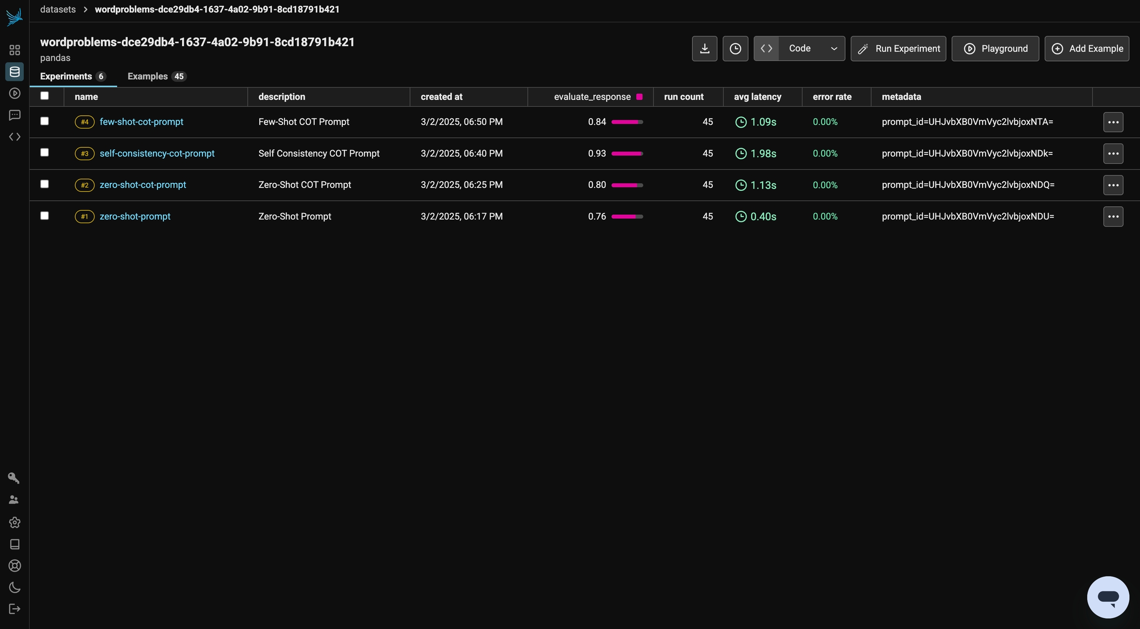 After running all of your experiments, you can compare the performance of different prompting techniques. Keep in mind that results may vary due to randomness and the model’s non-deterministic behavior.You can review your prompt version history in the Prompts tab and explore the Playground to iterate further and run additional experiments.To refine and test these prompts against other datasets, experiment with Chain of Thought (CoT) prompting to see its relevance to your specific use cases. With Phoenix, you can seamlessly integrate this process into your workflow using the TypeScript and Python Clients.