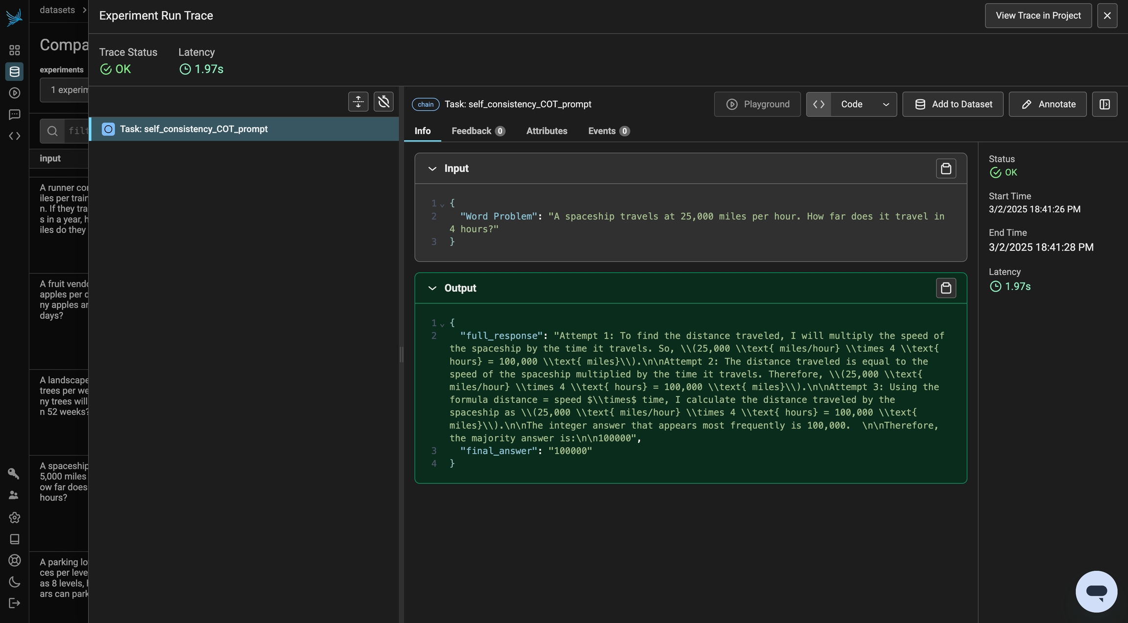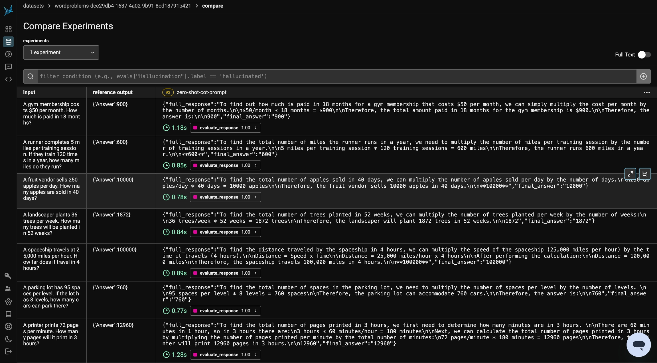 By clicking into the experiment in Phoenix, you can take a look at the steps the model took the reach the answer. By telling the model to think through the problem and output reasoning, we see a performance improvement.