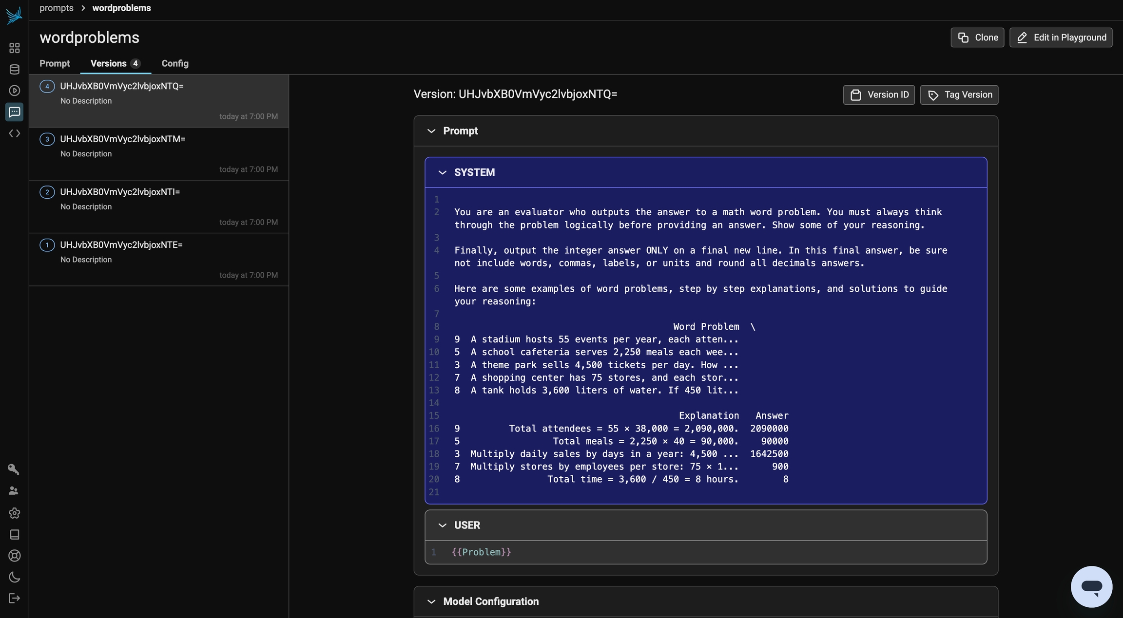 few_shot_COT_template = """You are an evaluator who outputs the answer to a math word problem. You must always think through the problem logically before providing an answer. Show some of your reasoning.Finally, output the integer answer ONLY on a final new line. In this final answer, be sure not include words, commas, labels, or units and round all decimals answers.Here are some examples of word problems, step by step explanations, and solutions to guide your reasoning:{examples}"""params = CompletionCreateParamsBase( model="gpt-3.5-turbo", temperature=0, messages=[ {"role": "system", "content": few_shot_COT_template.format(examples=few_shot_examples)}, {"role": "user", "content": "{{Problem}}"}, ],)few_shot_COT = PhoenixClient().prompts.create( name=prompt_identifier, prompt_description="Few Shot COT prompt", version=PromptVersion.from_openai(params),)