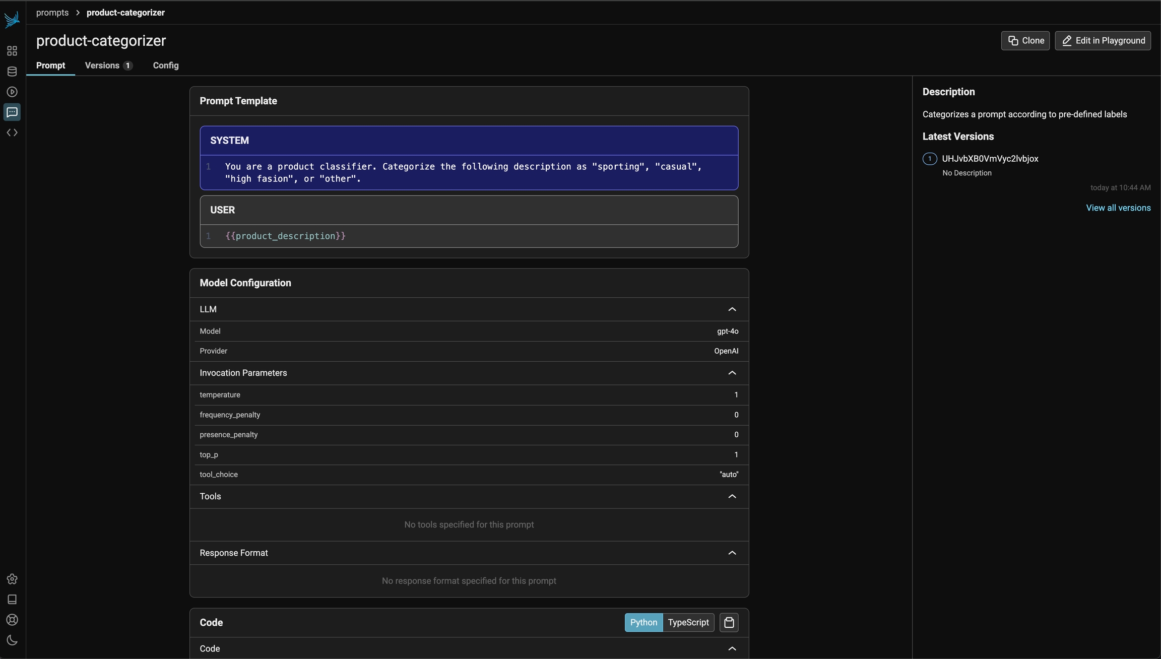 Once you’ve created a prompt, you probably need to make tweaks over time. The best way to make tweaks to a prompt is using the playground. Depending on how destructive a change you are making you might want to just create a new prompt version or clone the prompt.Editing a prompt in the playground