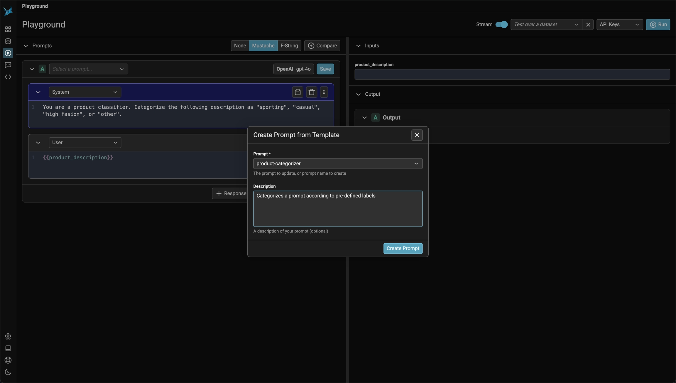 Navigate to the Prompts in the navigation and click the add prompt button on the top right. This will navigate you to the Playground. The playground is like the IDE where you will develop your prompt. The prompt section on the right lets you add more messages, change the template format (f-string or mustache), and an output schema (JSON mode).Compose a prompt