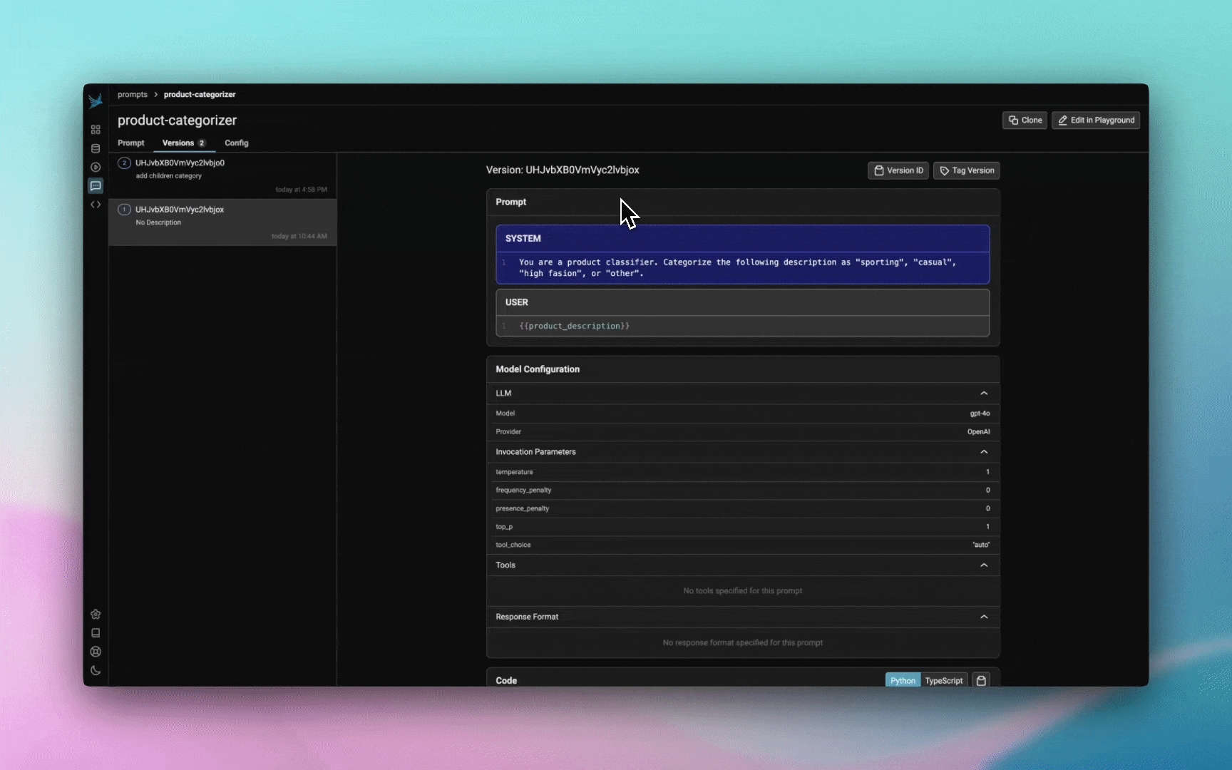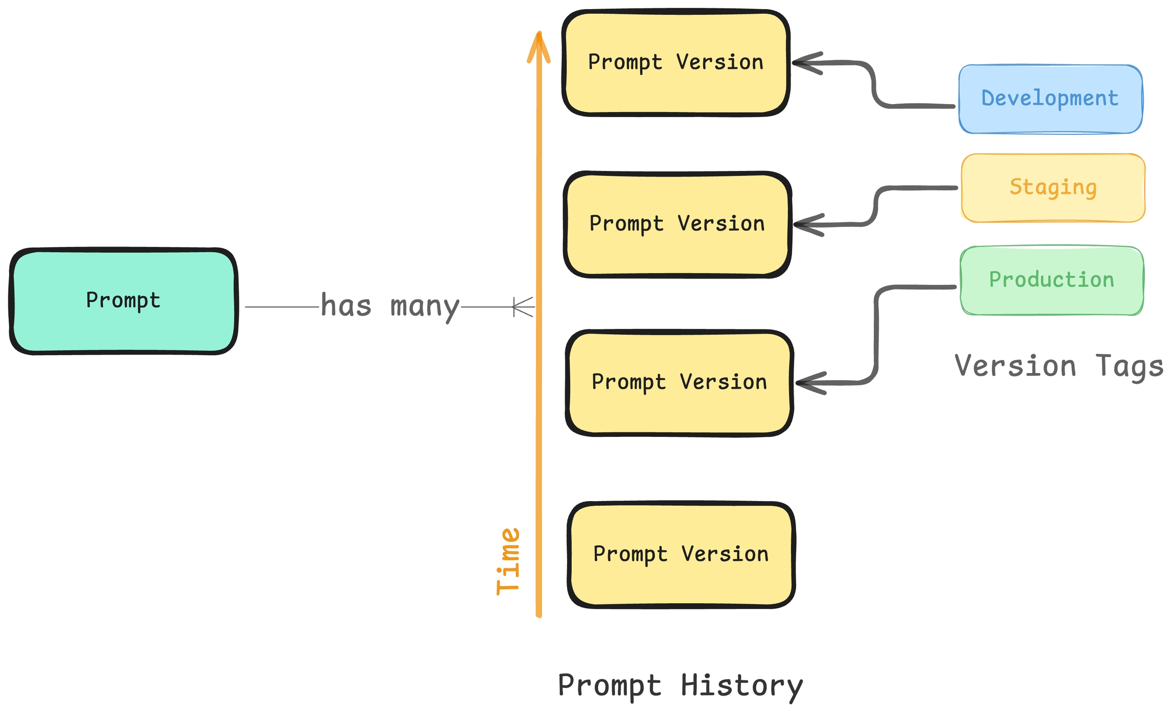 Once a prompt version is tagged, you can pull this version of the prompt into any environment that you would like (an application, an experiment). Similar to git tags, prompt version tags let you create a “release” of a prompt (e.x. pushing a prompt to staging). You can retrieve a prompt version by:- Using the tag name directly (e.g., “production”, “staging”, “development”)