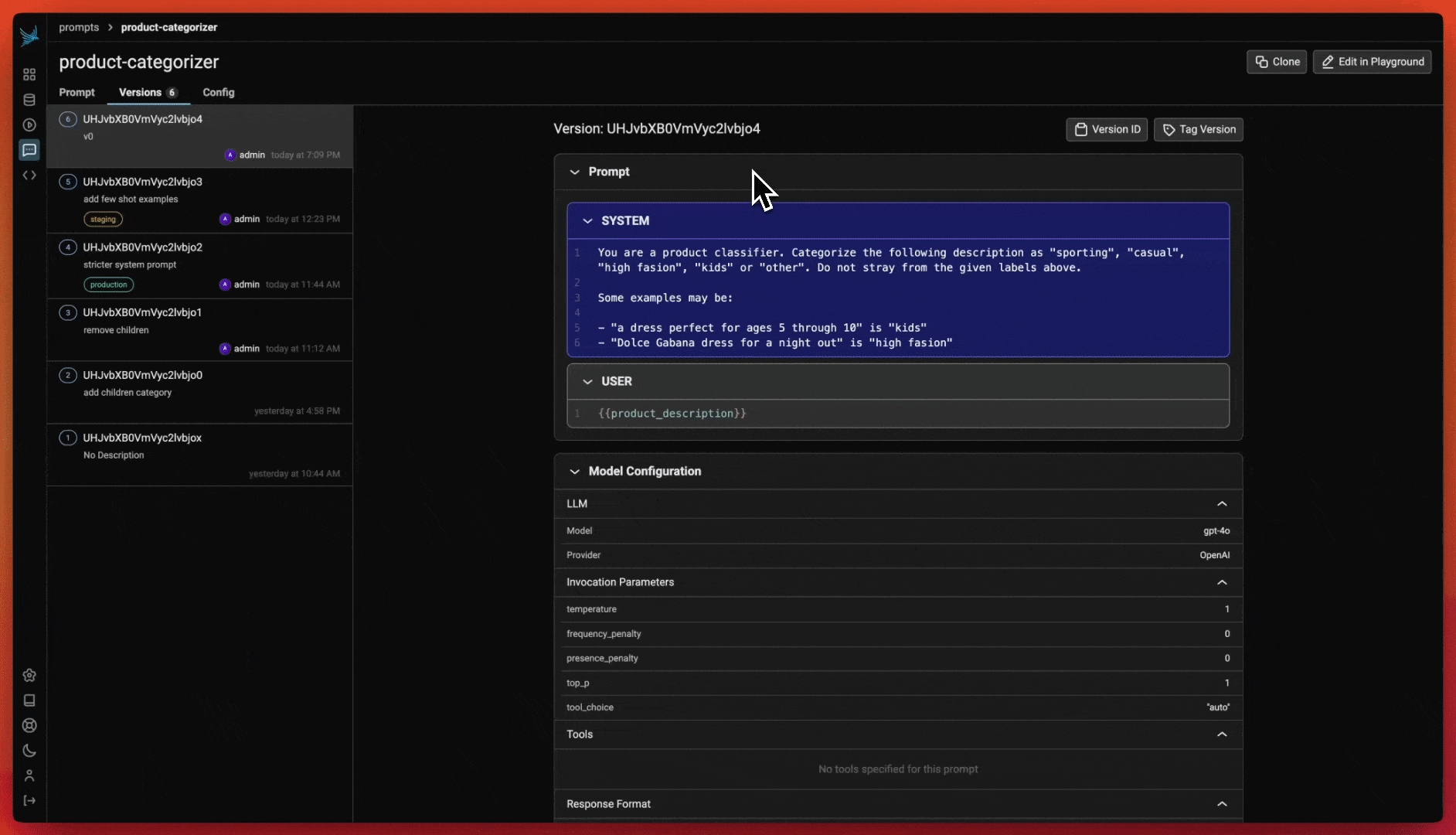 When you are ready to deploy a prompt to a certain environment (let’s say staging), the best thing to do is to tag a specific version of your prompt as ready. By default Phoenix offers 3 tags, production, staging, and development but you can create your own tags as well. Each tag can include an optional description to provide additional context about its purpose or significance. Tags are unique per prompt, meaning you cannot have two tags with the same name for the same prompt.