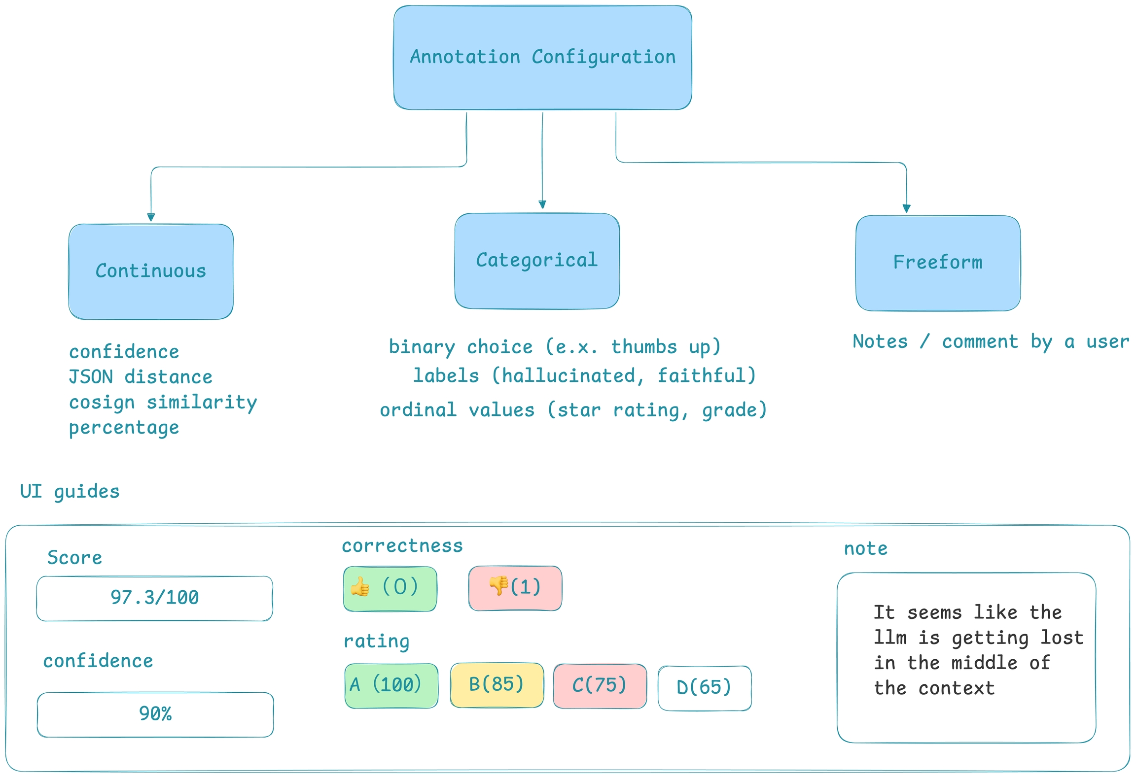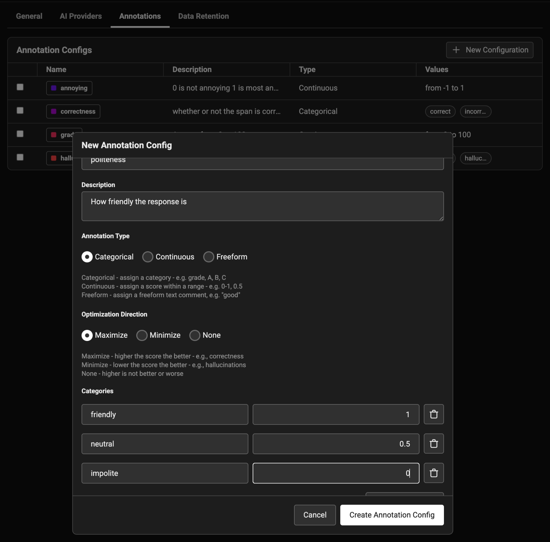 To annotate data in the UI, you first will want to setup a rubric for how to annotate. Navigate toSettings and create annotation configs (e.g. a rubric) for your data. You can create various different types of annotations: Categorical, Continuous, and Freeform.