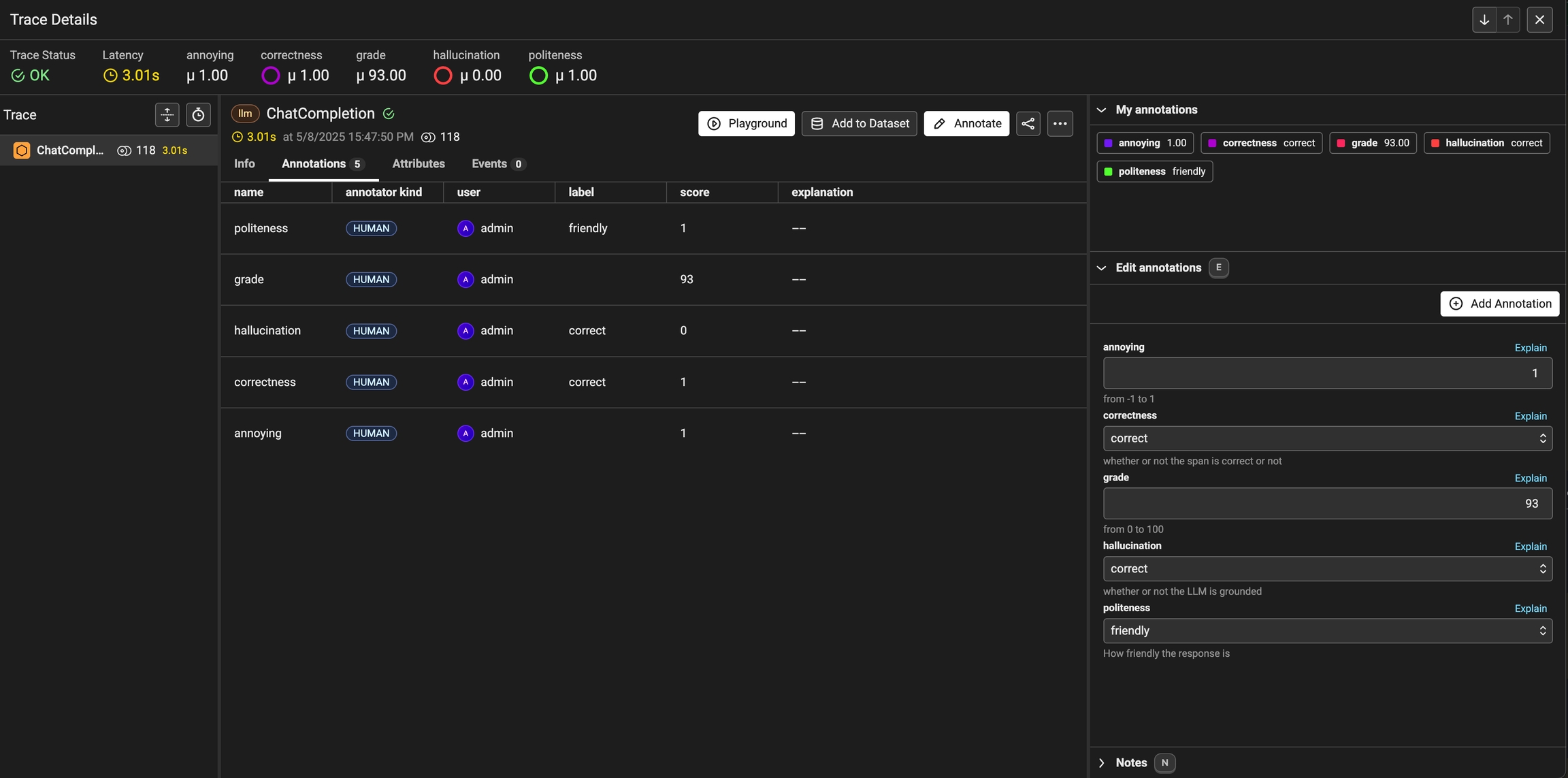 As annotations come in from various sources (annotators, evals), the entire list of annotations can be found under theAnnotations tab. Here you can see the author, the annotator kind (e.g. was the annotation performed by a human, llm, or code), and so on. This can be particularly useful if you want to see if different annotators disagree.