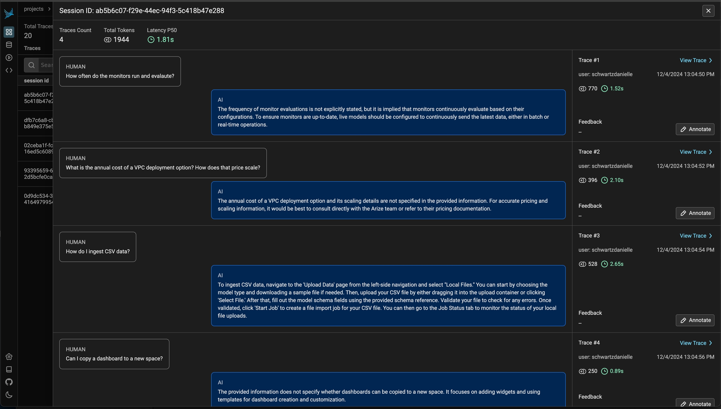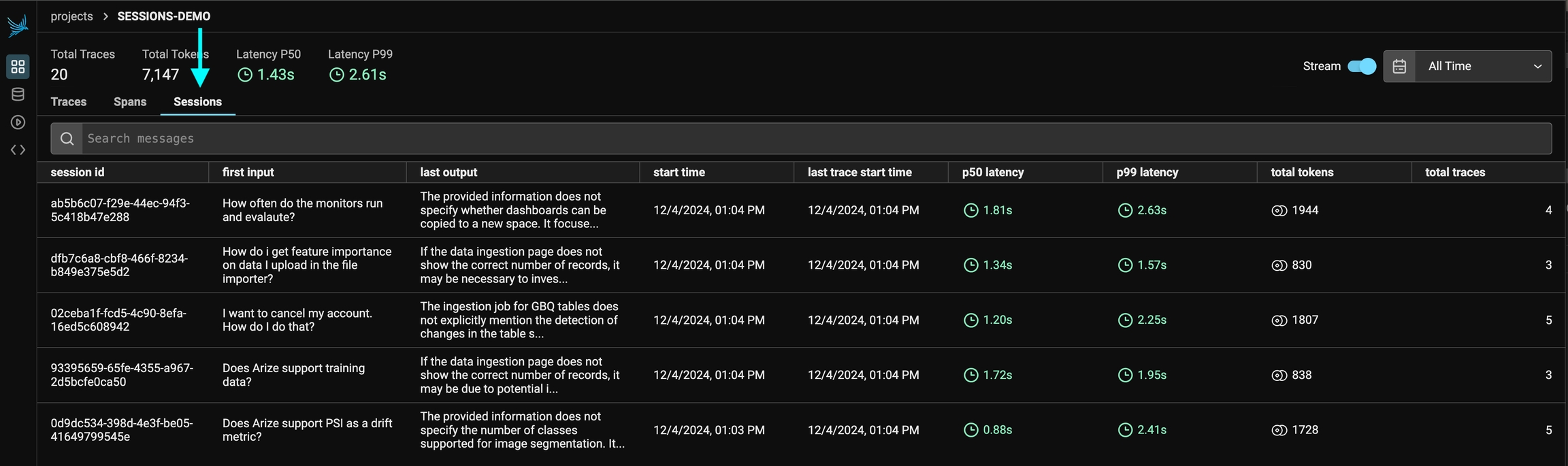 You can view the sessions for a given project by clicking on the “Sessions” tab in the project. You will see a list of all the recent sessions as well as some analytics. You can search the content of the messages to narrow down the list.